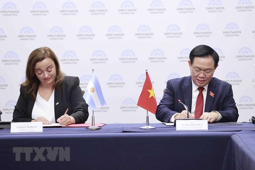 Chủ tịch Quốc hội Vương Đình Huệ và Chủ tịch Hạ viện Cộng hòa Argentina Cecilia Moreau ký thỏa thuận giữa Quốc hội Việt Nam và Hạ viện Argentina. (Ảnh: Doãn Tấn/TTXVN)