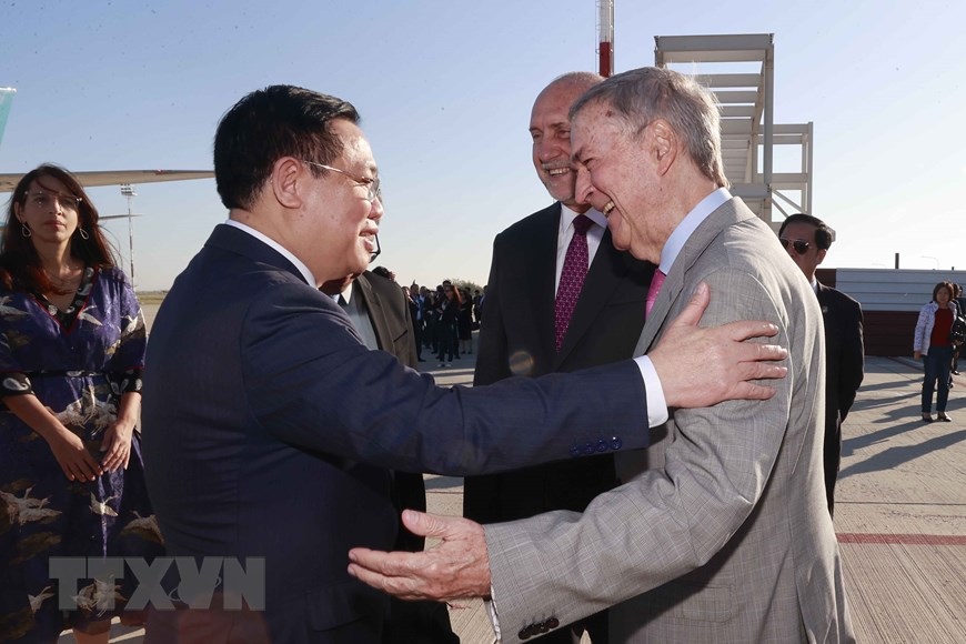 Chủ tịch Quốc hội Vương Đình Huệ với đại biểu tại sân bay quốc tế Rosario. (Ảnh: Doãn Tấn/TTXVN)