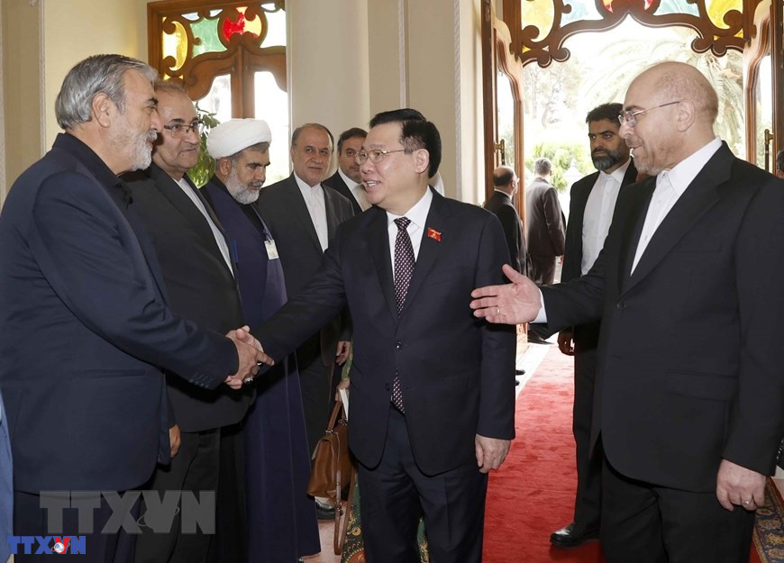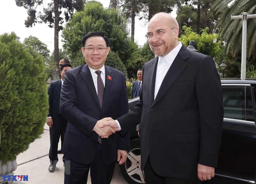 Chủ tịch Quốc hội Iran Mohammad Bagher Ghalibaf đón Chủ tịch Quốc hội Vương Đình Huệ. (Ảnh: Doãn Tấn/TTXVN)