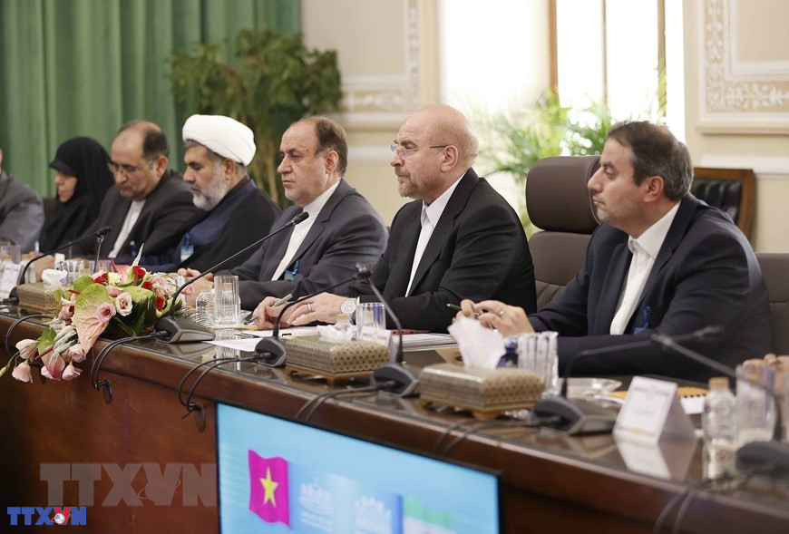 Chủ tịch Quốc hội Iran Mohammad Bagher Ghalibaf hội đàm với Chủ tịch Quốc hội Vương Đình Huệ. (Ảnh: Doãn Tấn/TTXVN)