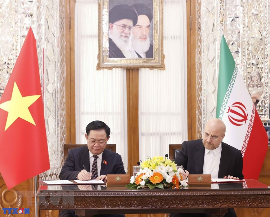 Chủ tịch Quốc hội Vương Đình Huệ và Chủ tịch Quốc hội Iran Mohammad Bagher Ghalibaf ký thỏa thuận hợp tác giữa Quốc hội hai nước. (Ảnh: Doãn Tấn/TTXVN)