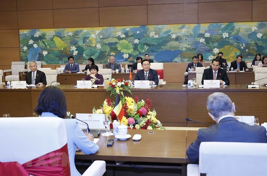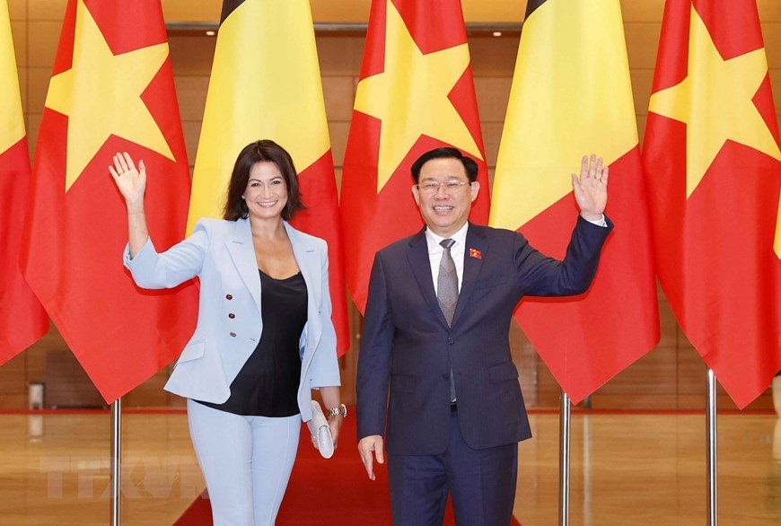 Chủ tịch Quốc hội Vương Đình Huệ và Chủ tịch Thượng viện Vương quốc Bỉ Stéphanie D'Hose. (Ảnh: Doãn Tấn/TTXVN)