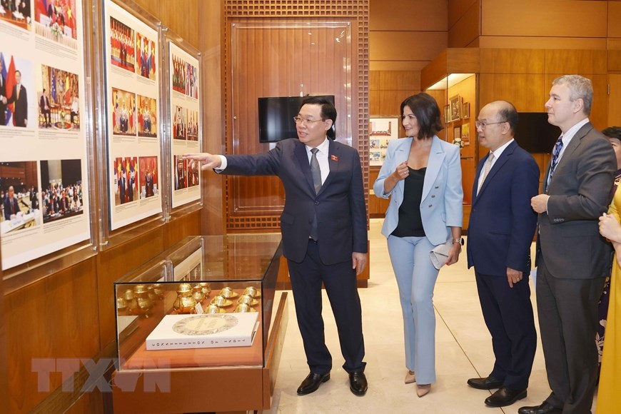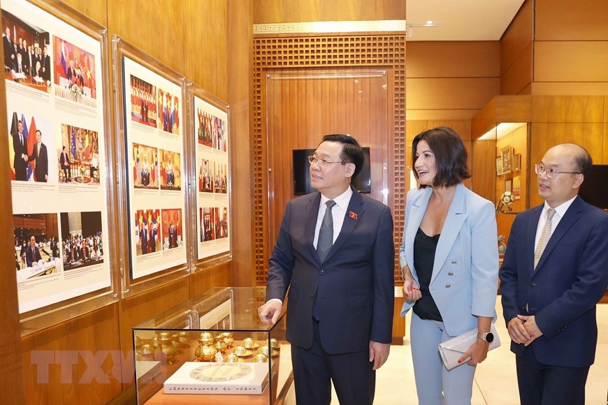 Chủ tịch Quốc hội Vương Đình Huệ và Chủ tịch Thượng viện Vương quốc Bỉ Stéphanie D'Hose tham quan Phòng truyền thống Nhà Quốc hội. (Ảnh: Doãn Tấn/TTXVN)