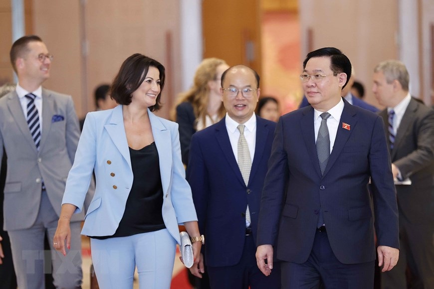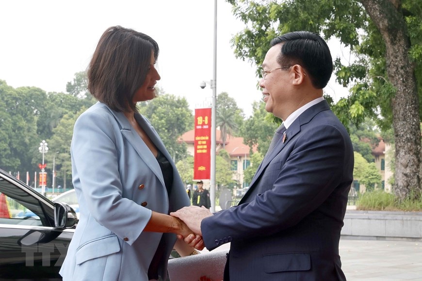 Chủ tịch Quốc hội Vương Đình Huệ đón Chủ tịch Thượng viện Vương quốc Bỉ Stéphanie D'Hose. (Ảnh: Doãn Tấn/TTXVN)