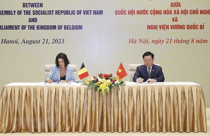 Chủ tịch Quốc hội Vương Đình Huệ và Chủ tịch Thượng viện Vương quốc Bỉ Stéphanie D'Hose ký Thỏa thuận hợp tác giữa Quốc hội Việt Nam và Nghị viện Bỉ. (Ảnh: Doãn Tấn/TTXVN)