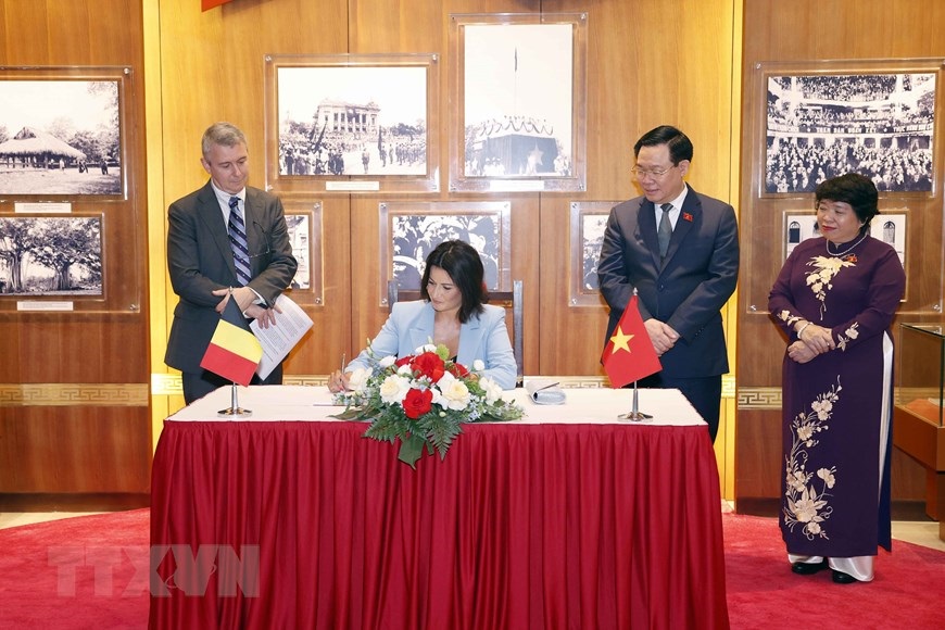 Chủ tịch Thượng viện Vương quốc Bỉ Stéphanie D'Hose ký Sổ lưu niệm tại Phòng truyền thống Nhà Quốc hội. (Ảnh: Doãn Tấn/TTXVN)