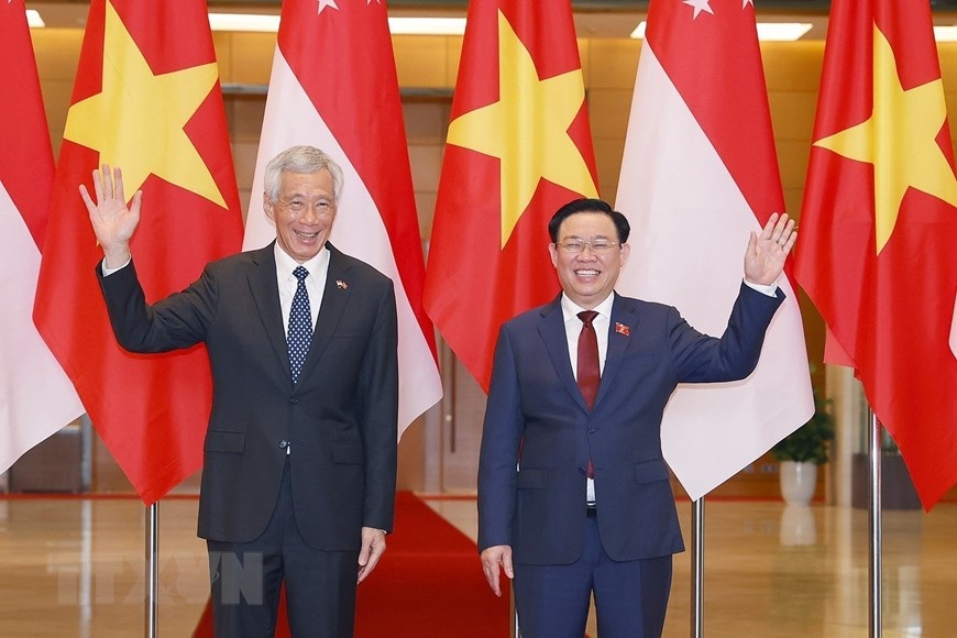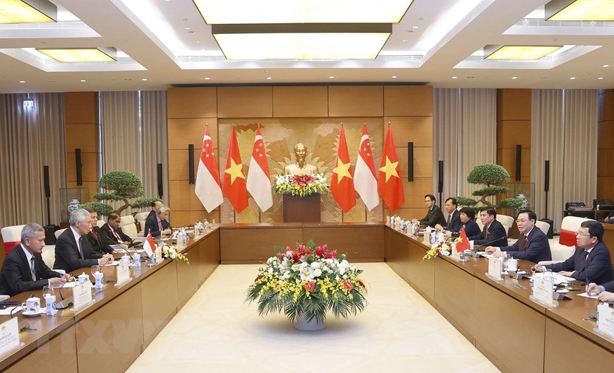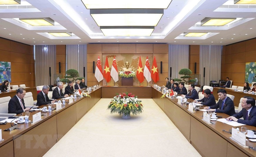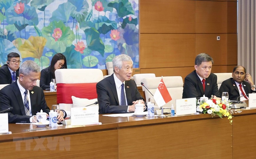 Chủ tịch Quốc hội Vương Đình Huệ với Thủ tướng Singapore Lý Hiển Long. (Ảnh: Doãn Tấn/TTXVN)