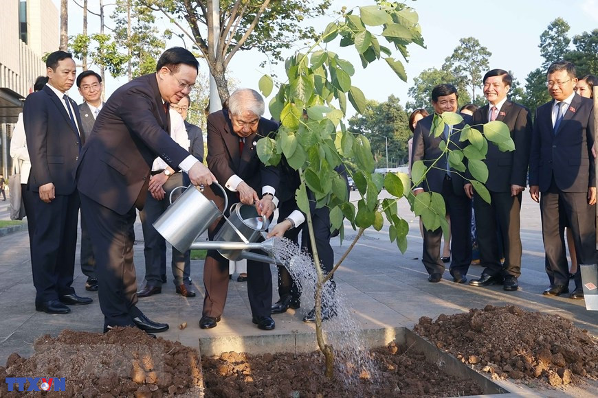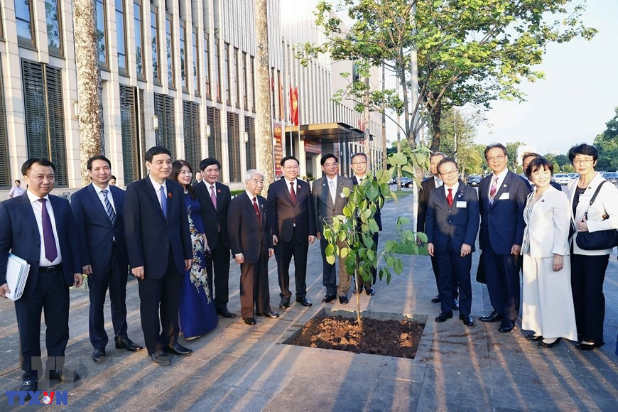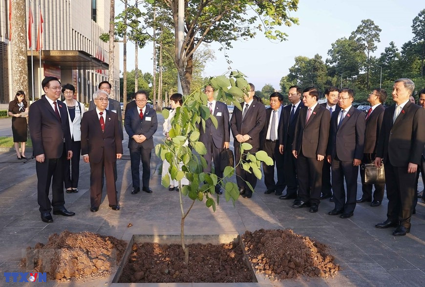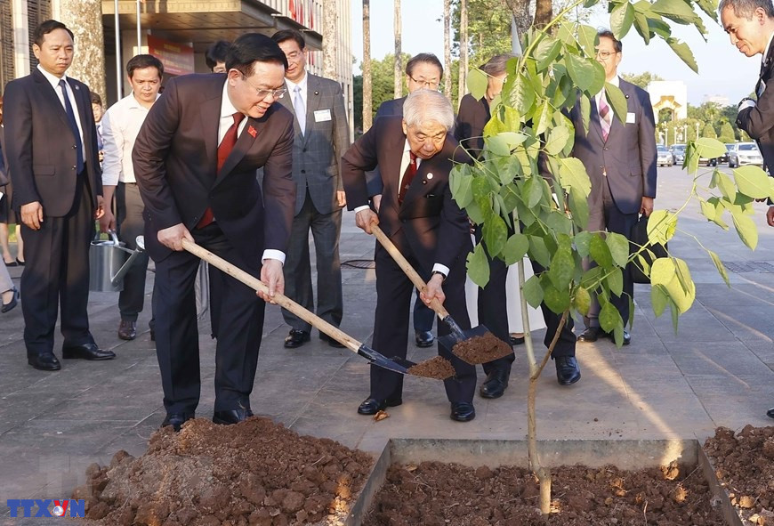 Chủ tịch Quốc hội Vương Đình Huệ và Chủ tịch Thượng viện Nhật Bản Otsuji Hidehisa thực hiện nghi thức trồng cây. (Ảnh: Doãn Tấn/TTXVN)