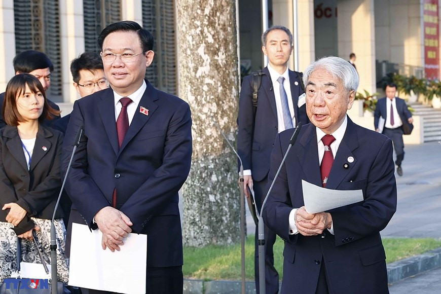 Chủ tịch Thượng viện Nhật Bản Otsuji Hidehisa và Chủ tịch Quốc hội Vương Đình Huệ tại buổi lễ. (Ảnh: Doãn Tấn/TTXVN)
