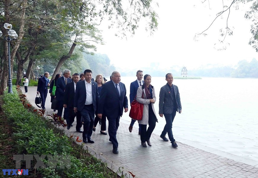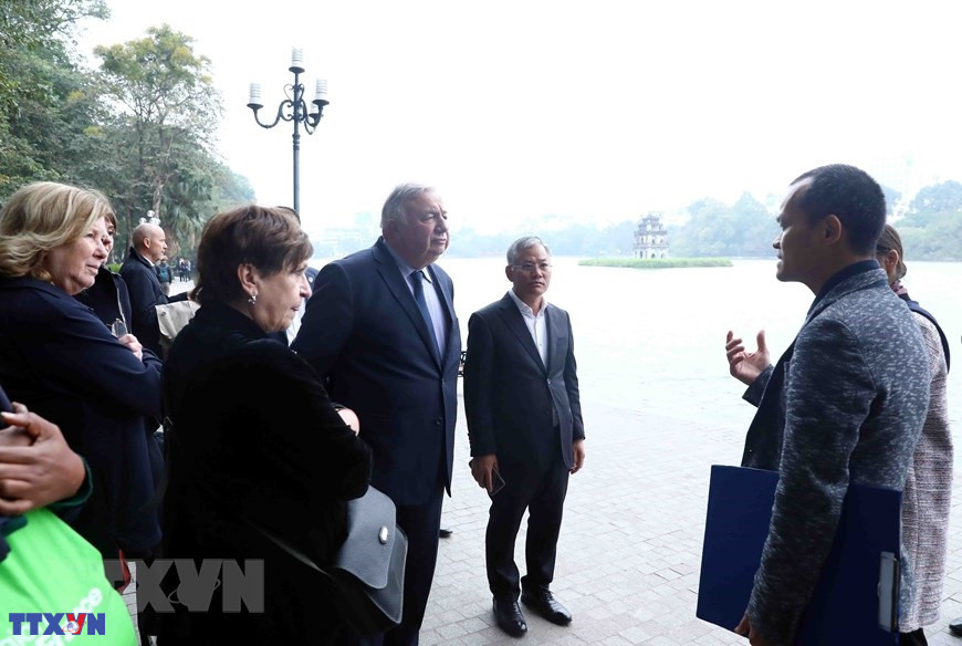 Chủ tịch Thượng viện Cộng hòa Pháp Gérard Larcher tham quan khu vực Hồ Hoàn Kiếm. (Ảnh: Phạm Kiên/TTXVN)