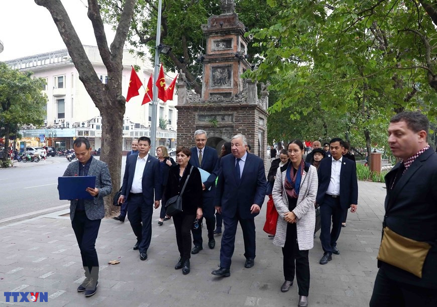Hà Nội (TTXVN 9/12/2022) Trong chương trình thăm chính thức Việt Nam, chiều 9/12/2022, tại Hà Nội, Chủ tịch Thượng viện Cộng hòa Pháp Gérard Larcher tham quan một số địa điểm tại khu vực phố cổ, trung tâm quận Hoàn Kiếm.