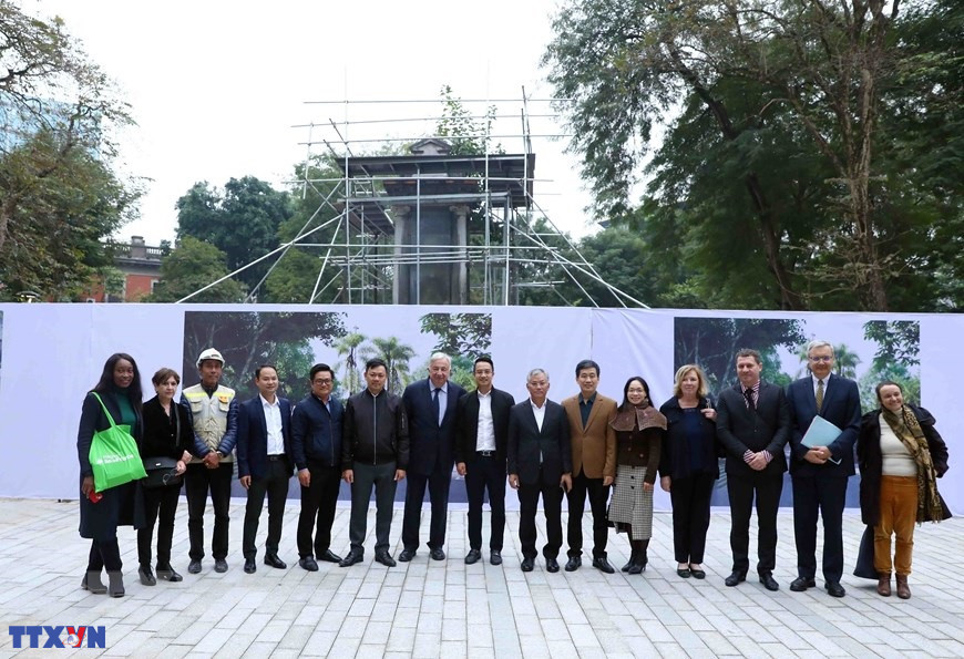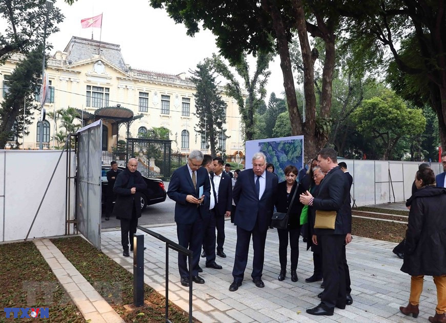 Chủ tịch Thượng viện Cộng hòa Pháp Gérard Larcher thăm quan dự án cải tạo vườn hoa Diên Hồng (dự án hợp tác giữa Hà Nội với vùng Île-de-France, Pháp). (Ảnh: Phạm Kiên/TTXVN)