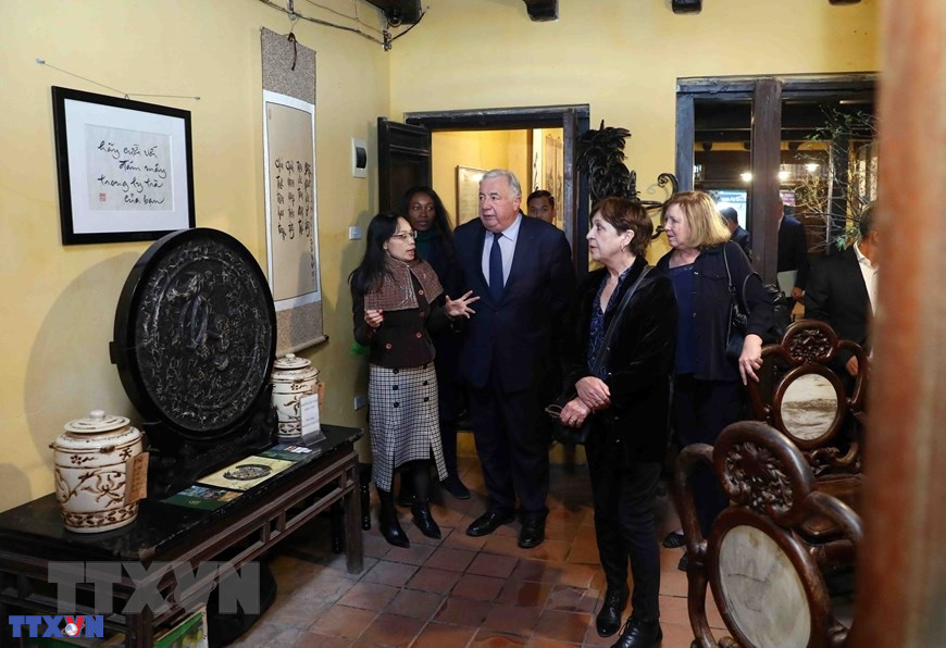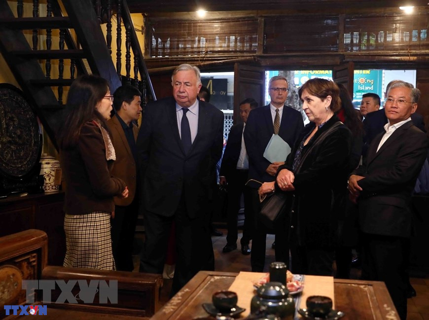 Chủ tịch Thượng viện Cộng hòa Pháp Gérard Larcher tại nhà số 87 Mã Mây, phường Hàng Buồm, quận Hoàn Kiếm. (Ảnh: Phạm Kiên/TTXVN)