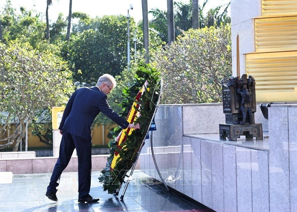 Chủ tịch Thượng viện Quốc hội Cộng hòa Séc Milos Vystrcil đến đặt vòng hoa tại Đài tưởng niệm các Anh hùng liệt sĩ (21/11/2025). Ảnh: Minh Đức – TTXVN