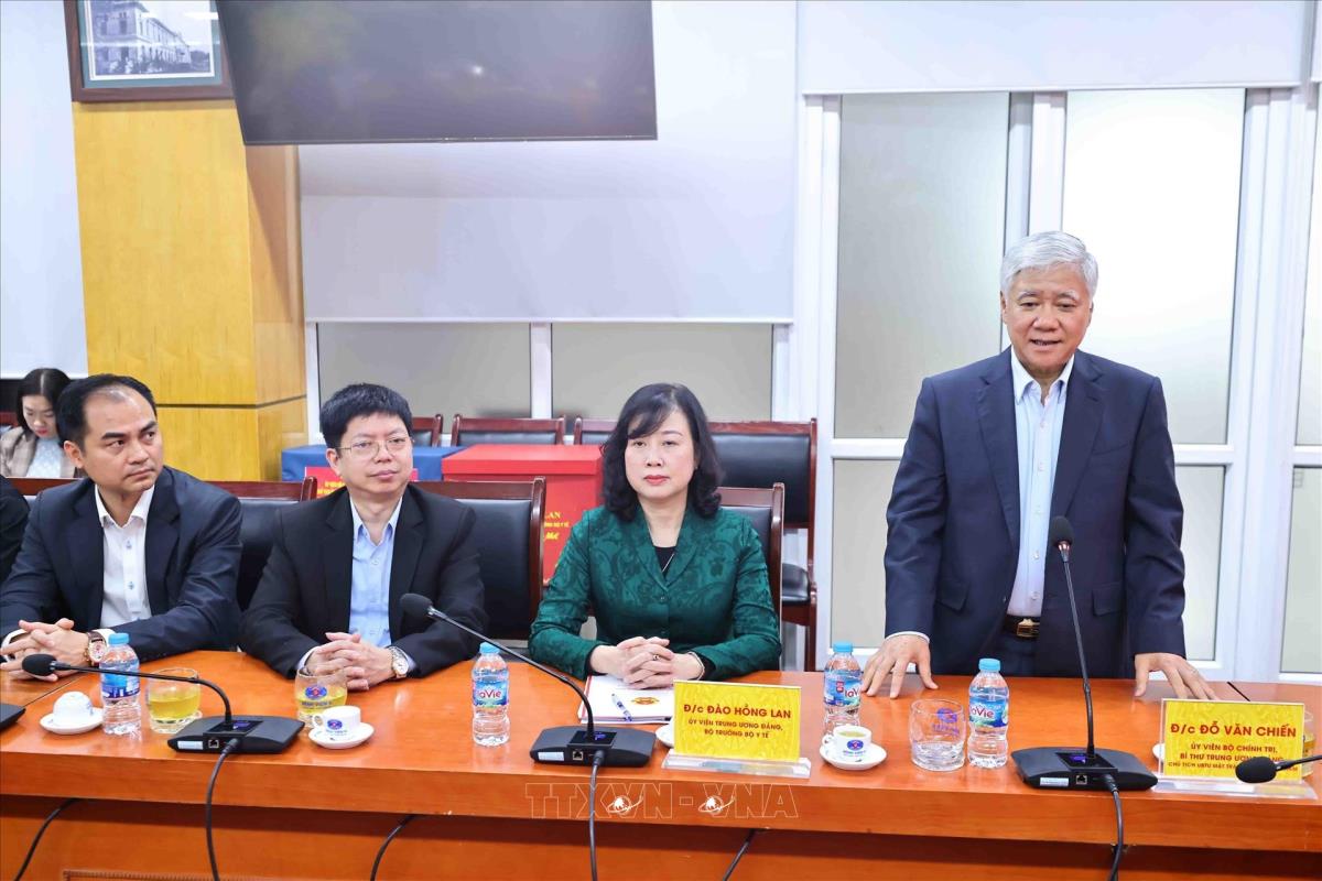 Đồng chí Đỗ Văn Chiến, Ủy viên Bộ Chính trị, Bí thư Trung ương Đảng, Chủ tịch Ủy ban Trung ương Mặt trận Tổ quốc Việt Nam phát biểu chúc Tết cán bộ nhân viên y tế Bệnh viện K (25/1/2025). Ảnh: Minh Đức – TTXVN