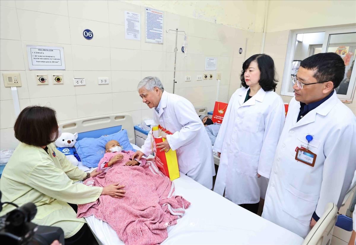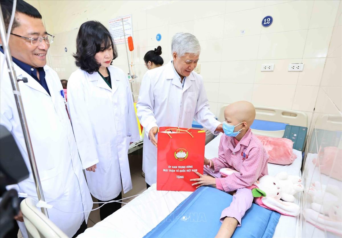 Chủ tịch UBTW MTTQ Việt Nam Đỗ Văn Chiến và Bộ trưởng Bộ Y tế Đào Hồng Lan trao quà, động viên bệnh nhi điều trị tại Bệnh viện K (25/1/2025). Ảnh: Minh Đức – TTXVN