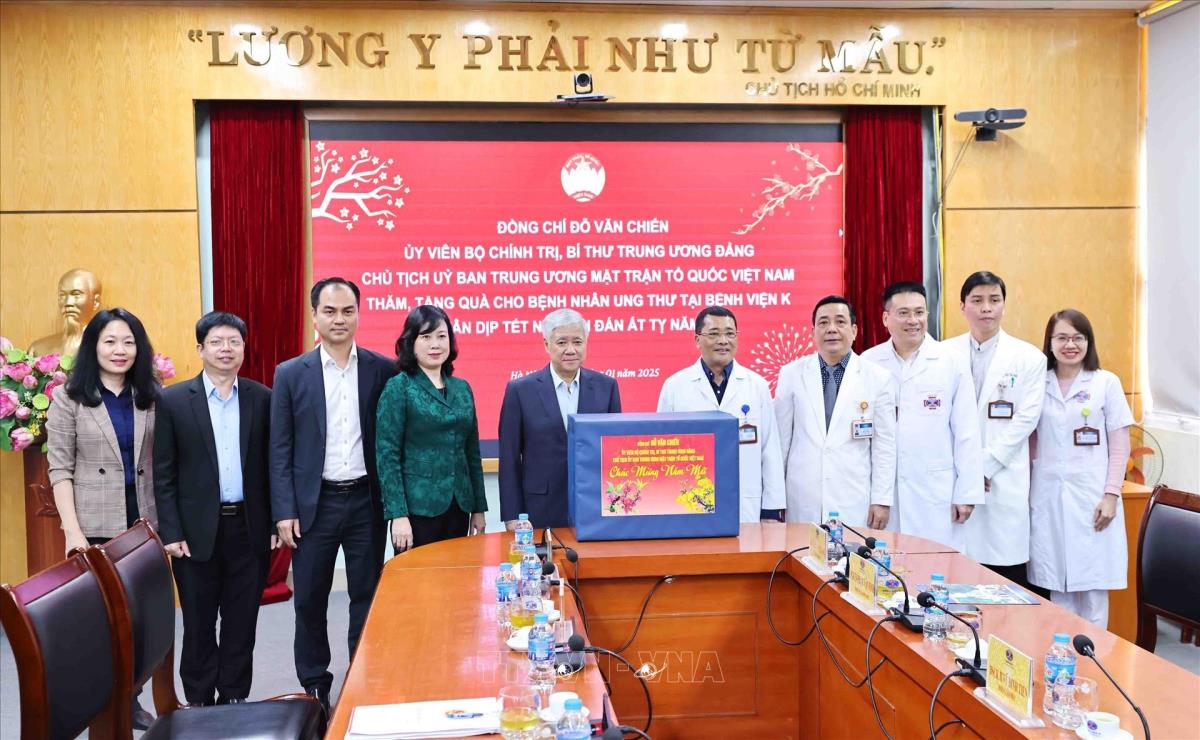Hà Nội (TTXVN 25/1/2025) Nhân dịp tết Nguyên đán Ất Tỵ 2025, chiều 25/1/2025 (26 Tết), Ủy viên Bộ Chính trị, Bí thư Trung ương Đảng, Chủ tịch Ủy ban Trung ương Mặt trận Tổ quốc Việt Nam Đỗ Văn Chiến tới thăm hỏi, động viên các y bác sĩ và tặng quà cho bệnh nhân ung thư đang điều trị tại Bệnh viện K cơ sở Tân Triều (Thanh Trì, Hà Nội).
