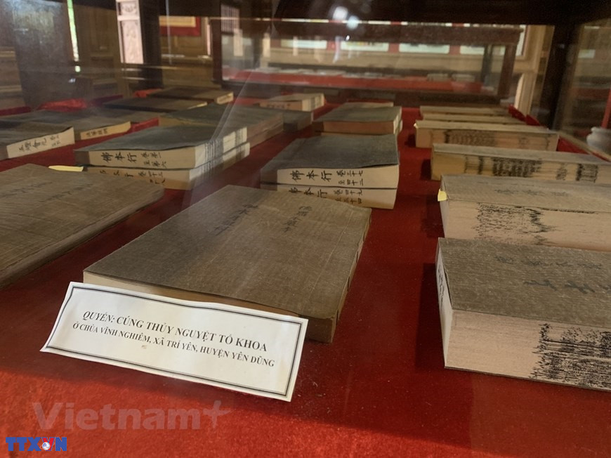 Theo các nhà nghiên cứu, 3.050 tấm mộc bản bằng chữ Hán và Nôm ở chùa Vĩnh Nghiêm, số ít bằng chữ Phạn được khắc từ thế kỷ XVII đến đầu thế kỷ XX. Nội dung trong mộc bản là các kinh, sách do Tam tổ Trúc Lâm là Trần Nhân Tông, Pháp Loa và Huyền Quang cùng các hệ phái kế tiếp biên soạn. (Ảnh: M.Mai/Vietnam+)