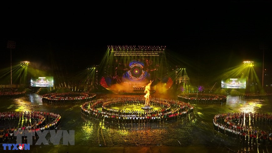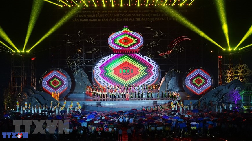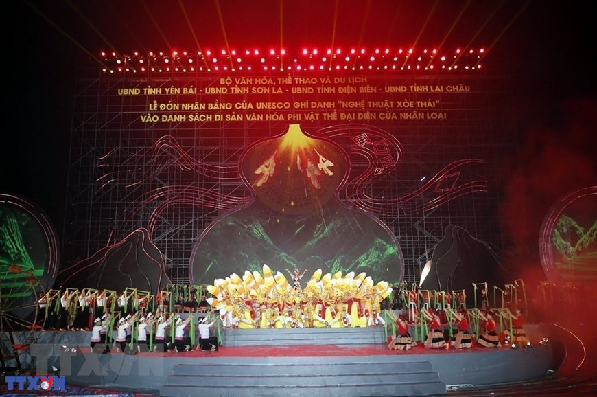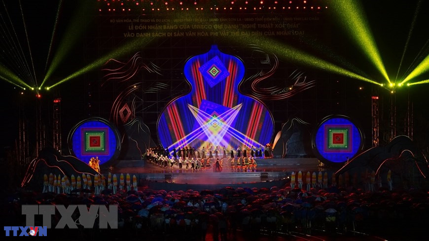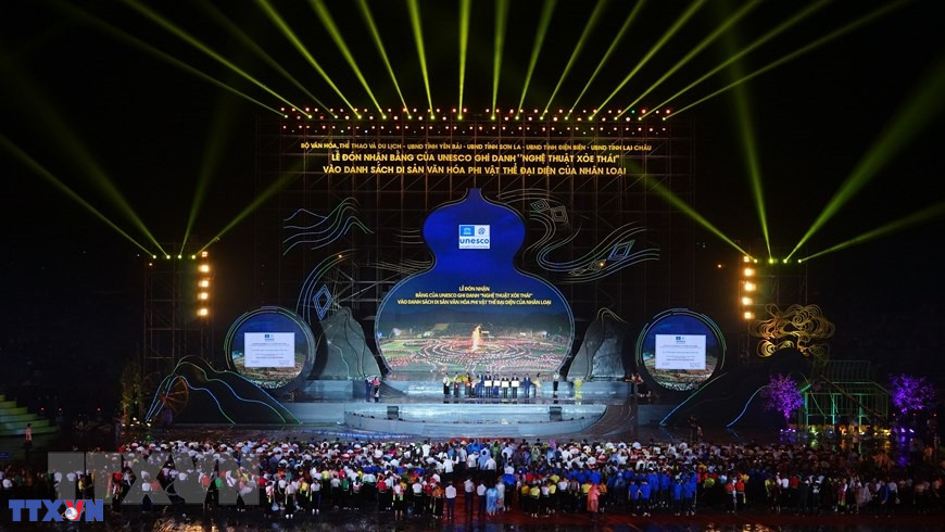 Lễ đón nhận Bằng của UNESCO ghi danh “Nghệ thuật Xòe Thái” vào Danh sách Di sản Văn hóa Phi vật thể Đại diện của Nhân loại. (Ảnh: Tuấn Anh/TTXVN)