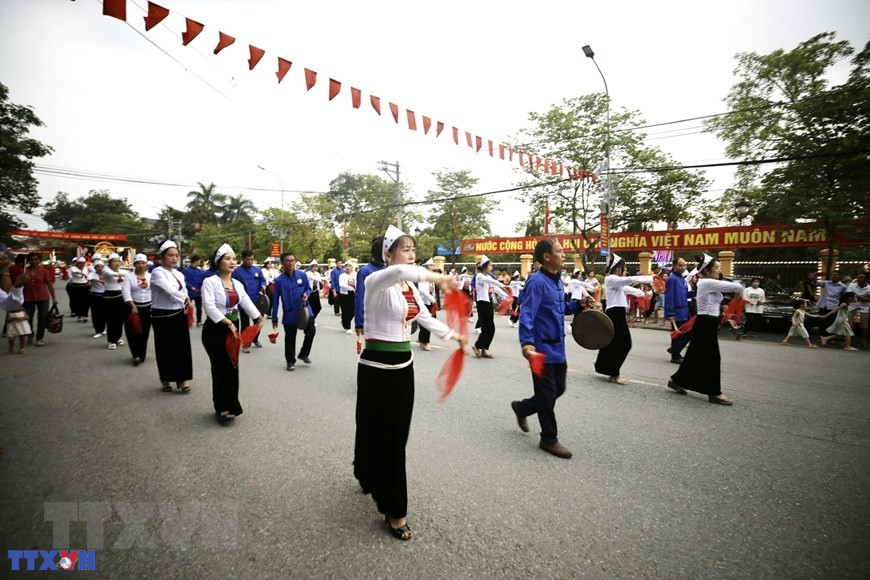 Màn biểu diễn đường phố với sự tham gia của hơn 510 nghệ nhân và người dân trước giờ khai mạc buổi lễ. (Ảnh: Tuấn Anh/TTXVN)