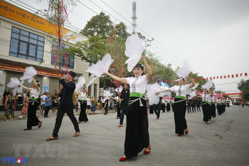 Màn trình diễn nghệ thuật Xòe Thái với sự tham dự của 3.000 diễn viên, nghệ nhân và học sinh tại buổi lễ. (Ảnh: Tuấn Anh/TTXVN)