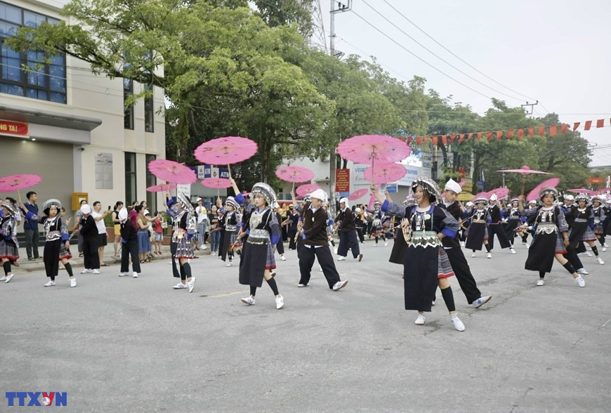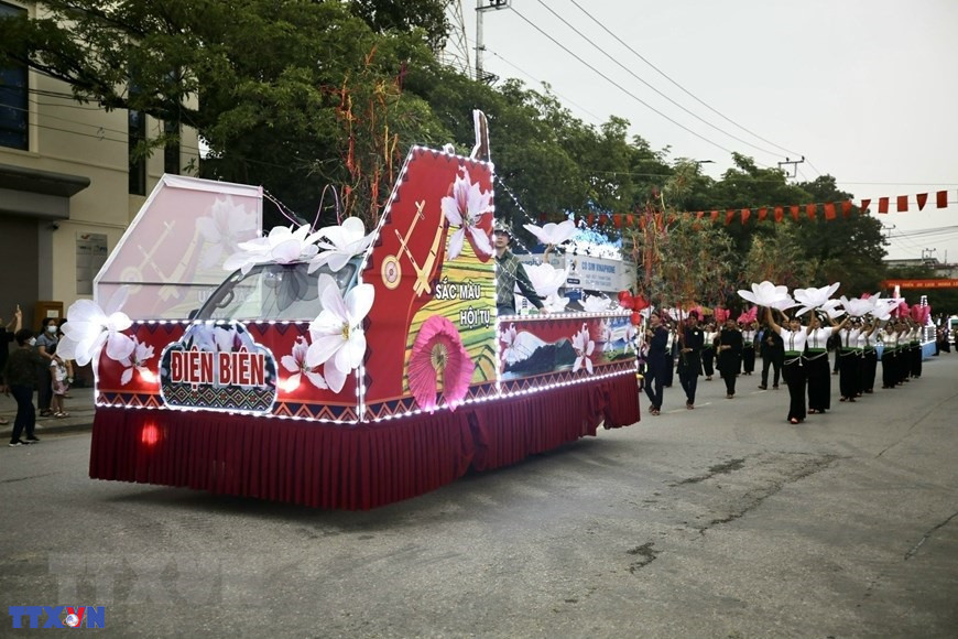 Màn biểu diễn đường phố của các nghệ nhân tỉnh Điện Biên trước giờ khai mạc buổi lễ. (Ảnh: Tuấn Anh/TTXVN)
