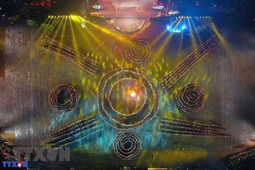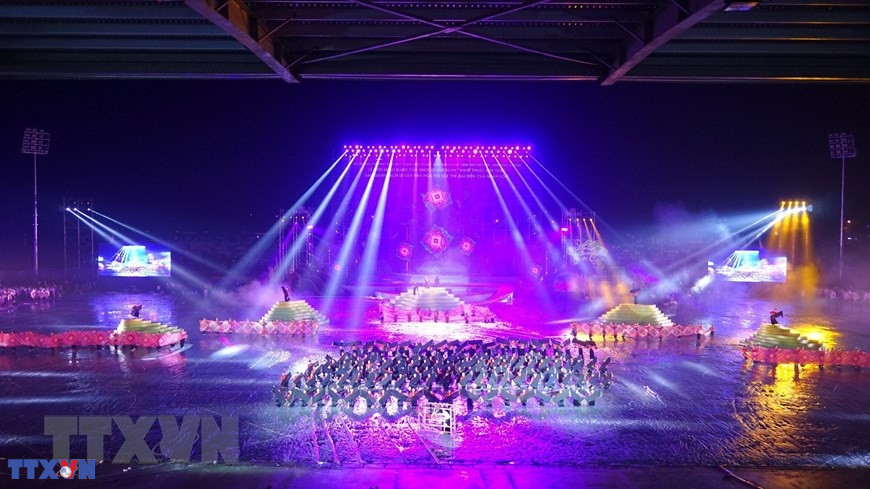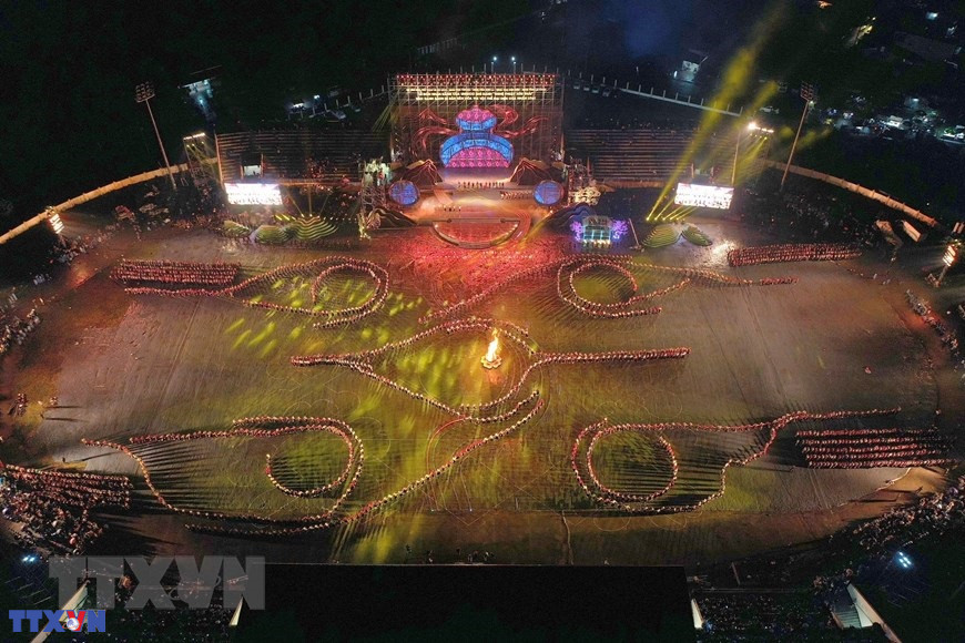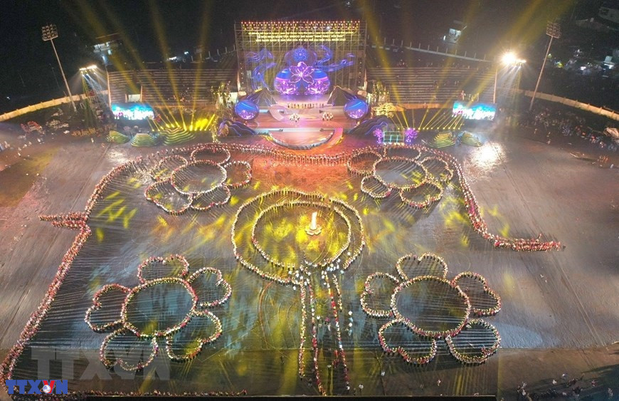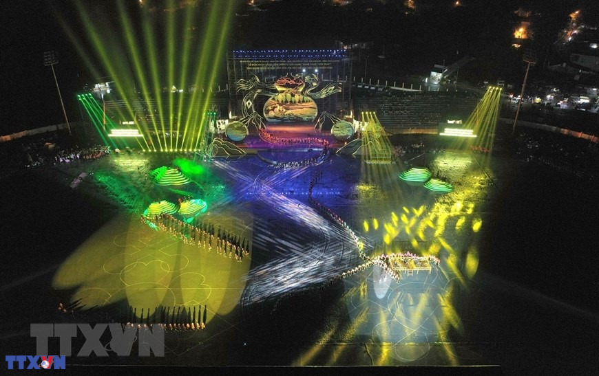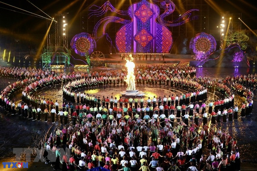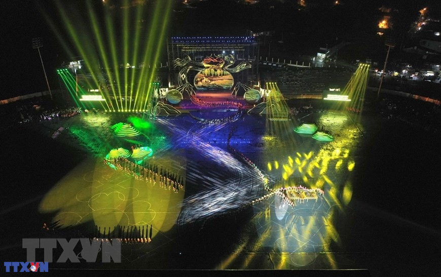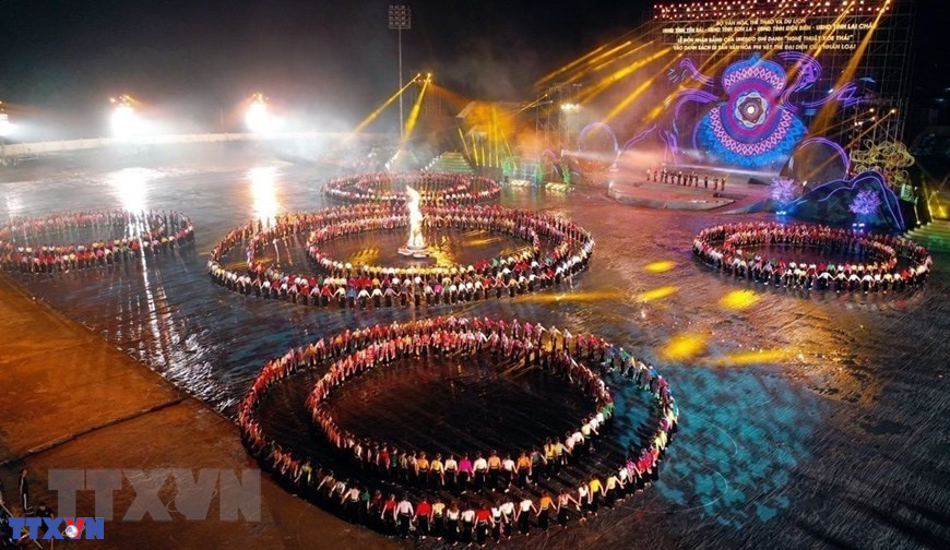 Chương trình nghệ thuật với chủ đề "Xòe Thái - Tinh hoa miền di sản" với sự tham gia của trên 3.000 diễn viên, nghệ nhân và nhân dân. (Ảnh: Dương Giang/TTXVN)