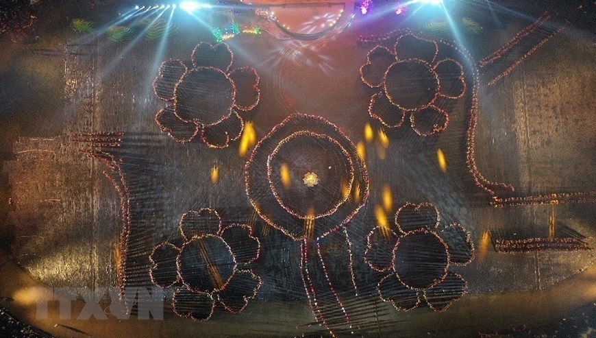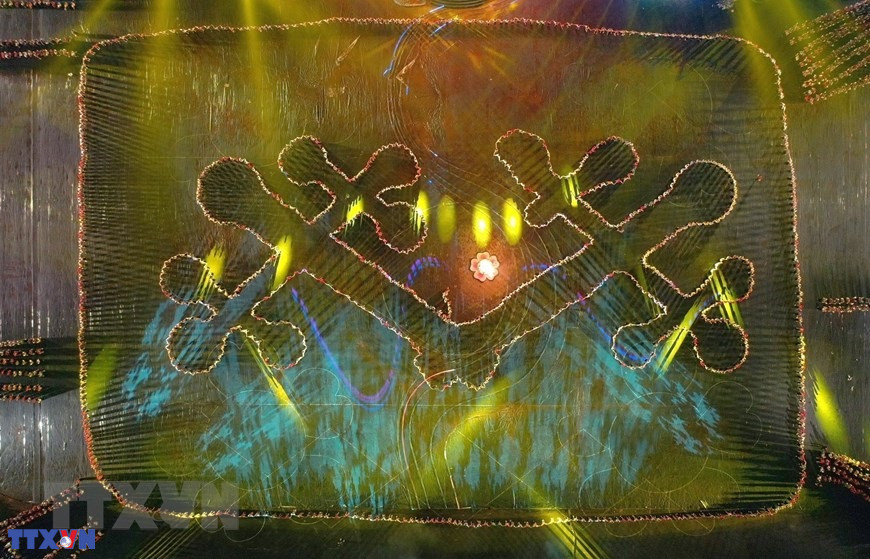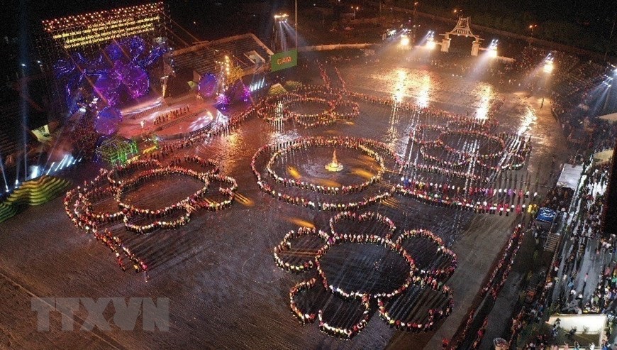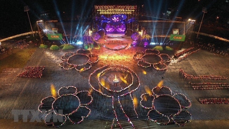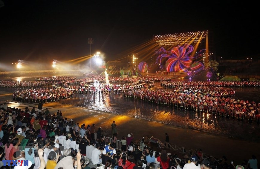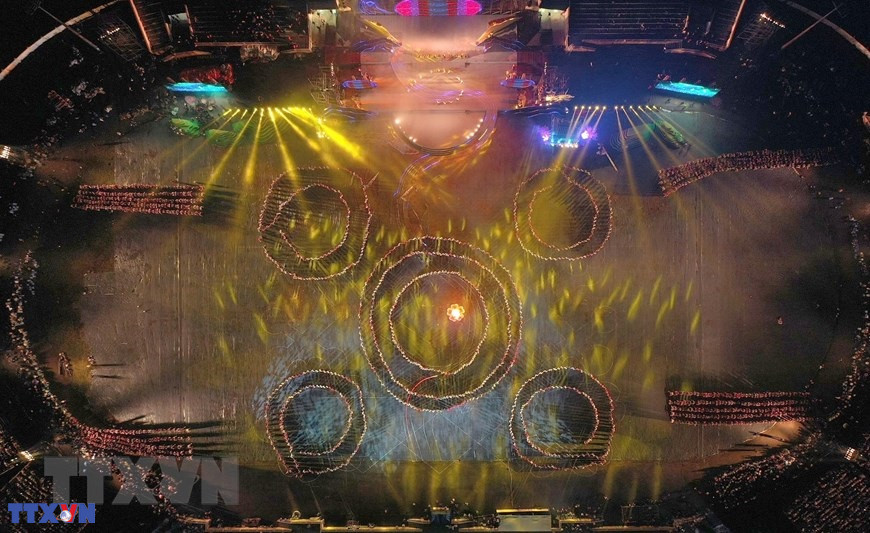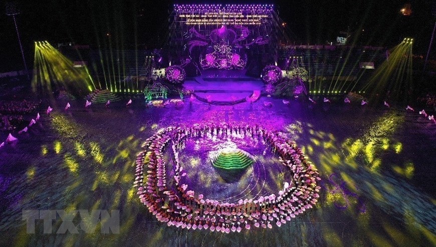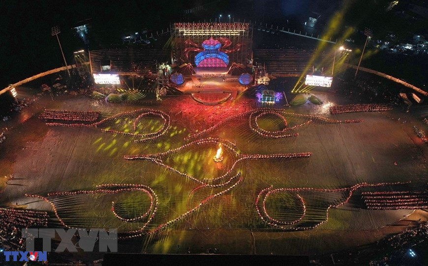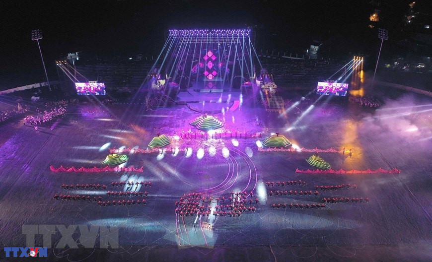 Chương trình nghệ thuật với chủ đề "Xòe Thái - Tinh hoa miền di sản" với sự tham gia của trên 3.000 diễn viên, nghệ nhân và nhân dân. (Ảnh: Dương Giang/TTXVN)