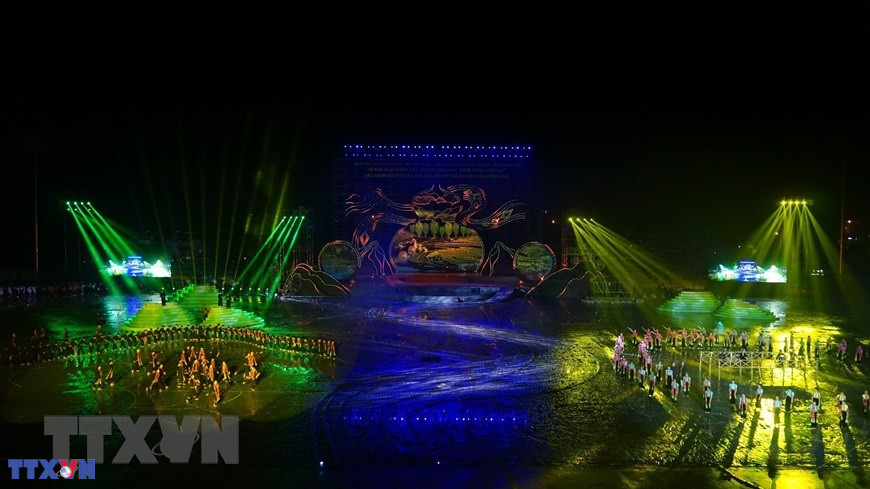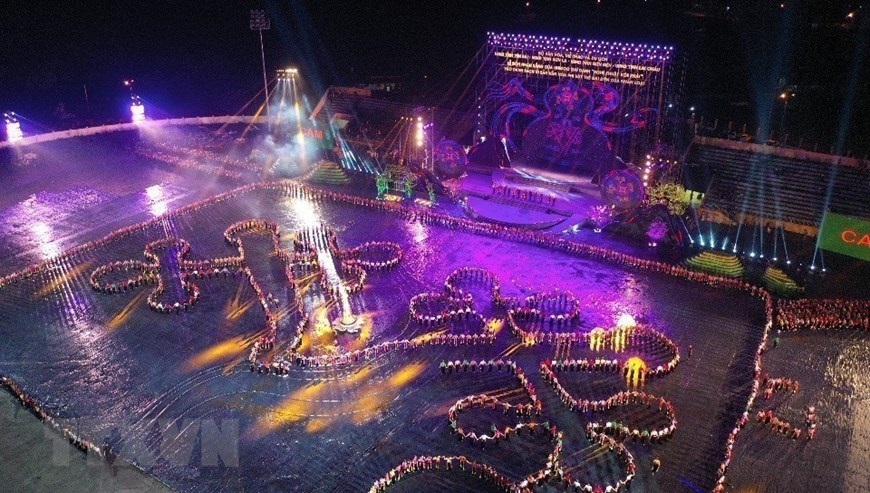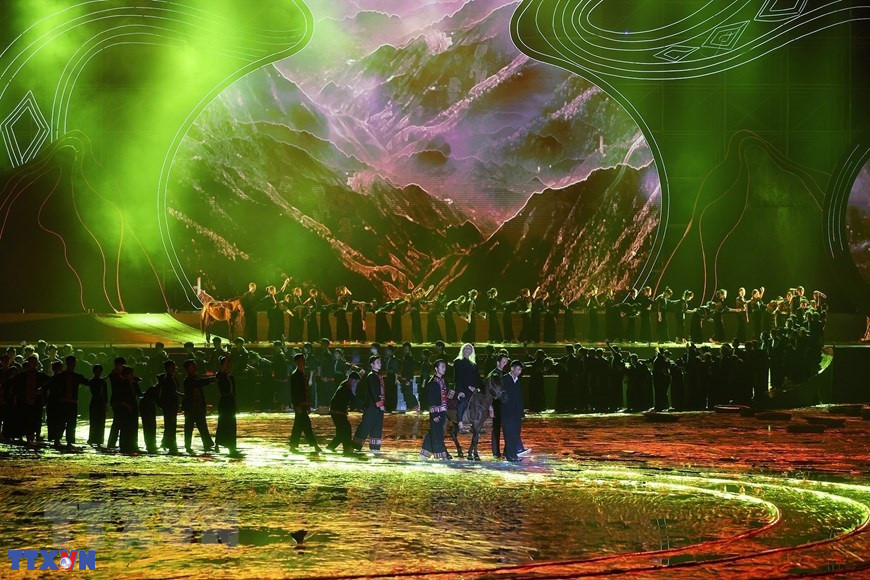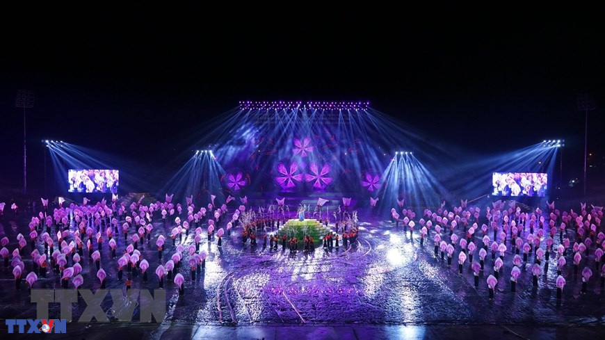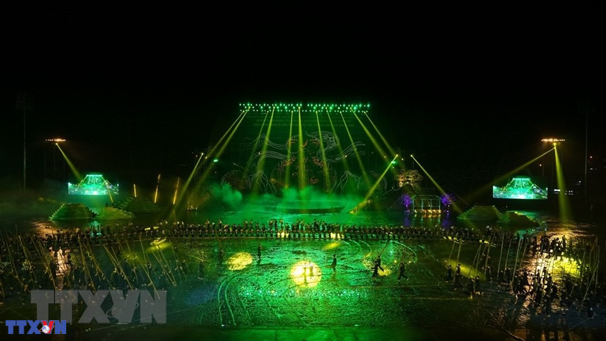Chương trình nghệ thuật đặc biệt với chủ đề "Xòe Thái - Tinh hoa miền di sản" với sự tham dự của 3.000 diễn viên, nghệ nhân và học sinh tại buổi lễ. (Ảnh: Tuấn Anh/TTXVN)