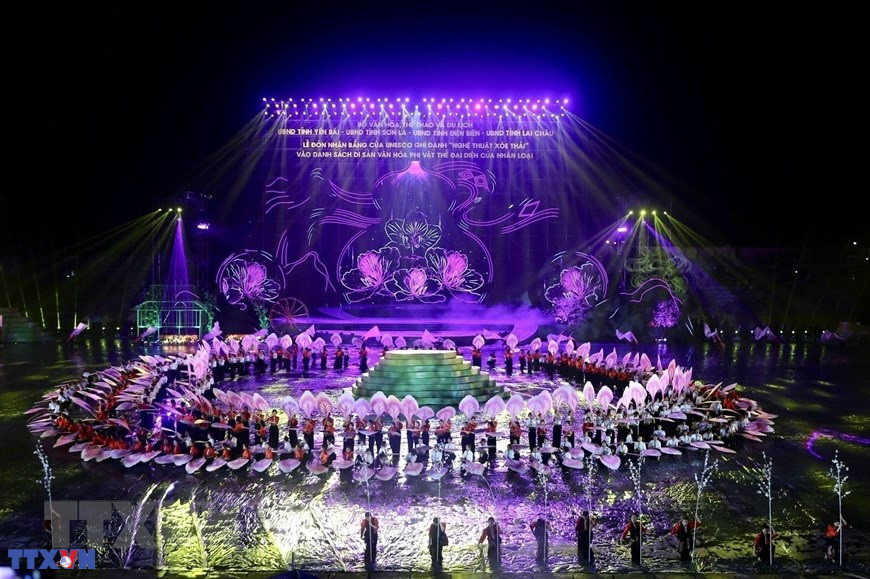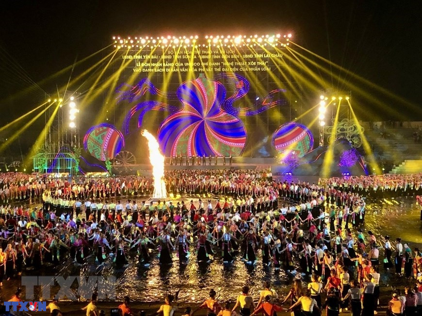 Hà Nội (TTXVN 25/09/2022) Chương trình nghệ thuật với chủ đề "Xòe Thái - Tinh hoa miền di sản" hấp dẫn, hoành tráng và đầy màu sắc tối 24/9/2022 tại lễ đón Bằng Công nhận Xòe Thái là Di sản Văn hóa Phi vật thể Đại diện Nhân loại.