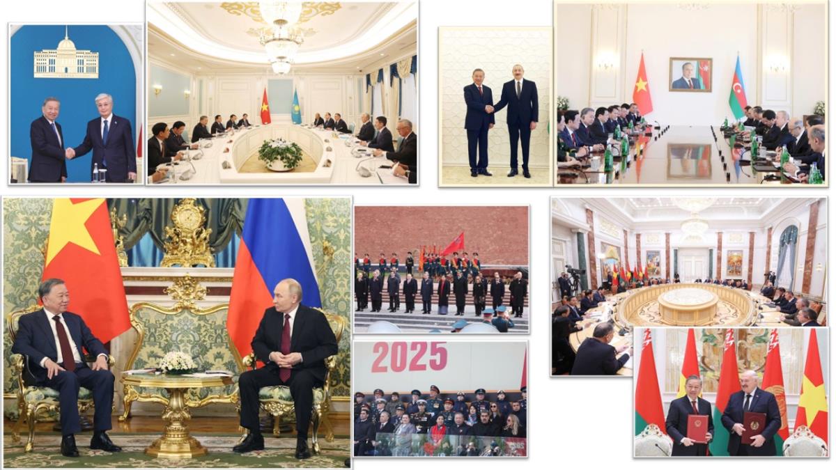 Hà Nội (TTXVN 14/5/2025) Chuyến công tác của Tổng Bí thư Tô Lâm và Phu nhân cùng đoàn đại biểu cấp cao Việt Nam thăm cấp Nhà nước Cộng hòa Kazakhstan, thăm cấp Nhà nước Cộng hòa Azerbaijan, thăm chính thức Liên bang Nga và dự Lễ kỷ niệm 80 năm Ngày Chiến thắng trong chiến tranh Vệ quốc vĩ đại và thăm cấp Nhà nước Cộng hòa Belarus từ ngày 5-12/5 đã thành công tốt đẹp.
