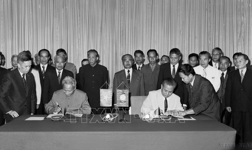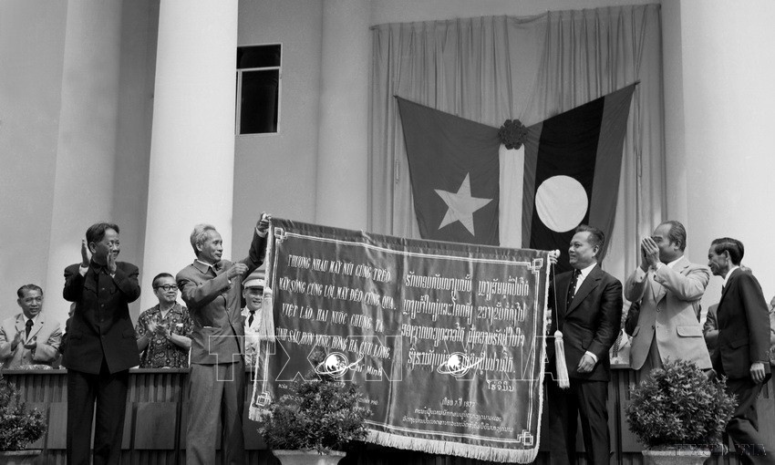 Trong chuyến thăm hữu nghị chính thức Lào từ ngày 15 - 18/7/1977, Tổng Bí thư Lê Duẩn và Thủ tướng Phạm Văn Đồng thay mặt Trung ương Đảng và Chính phủ Việt Nam trao tặng Trung ương Đảng và Chính phủ Lào bức trướng thêu 4 câu thơ nổi tiếng của Chủ tịch Hồ Chí Minh: “Thương nhau mấy núi cũng trèo. Mấy sông cũng lội, mấy đèo cũng qua. Việt - Lào hai nước chúng ta. Tình sâu hơn nước Hồng Hà Cửu Long”. Ảnh: TTXVN