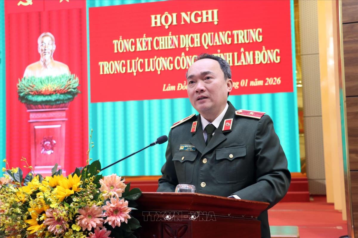Thiếu tướng, Giám đốc Công an tỉnh Lâm Đồng Trương Minh Đương tổng kết Chiến dịch Quang Trung của lực lượng Công an tỉnh (12/1/2026). Ảnh Chu Quốc Hùng- TTXVN