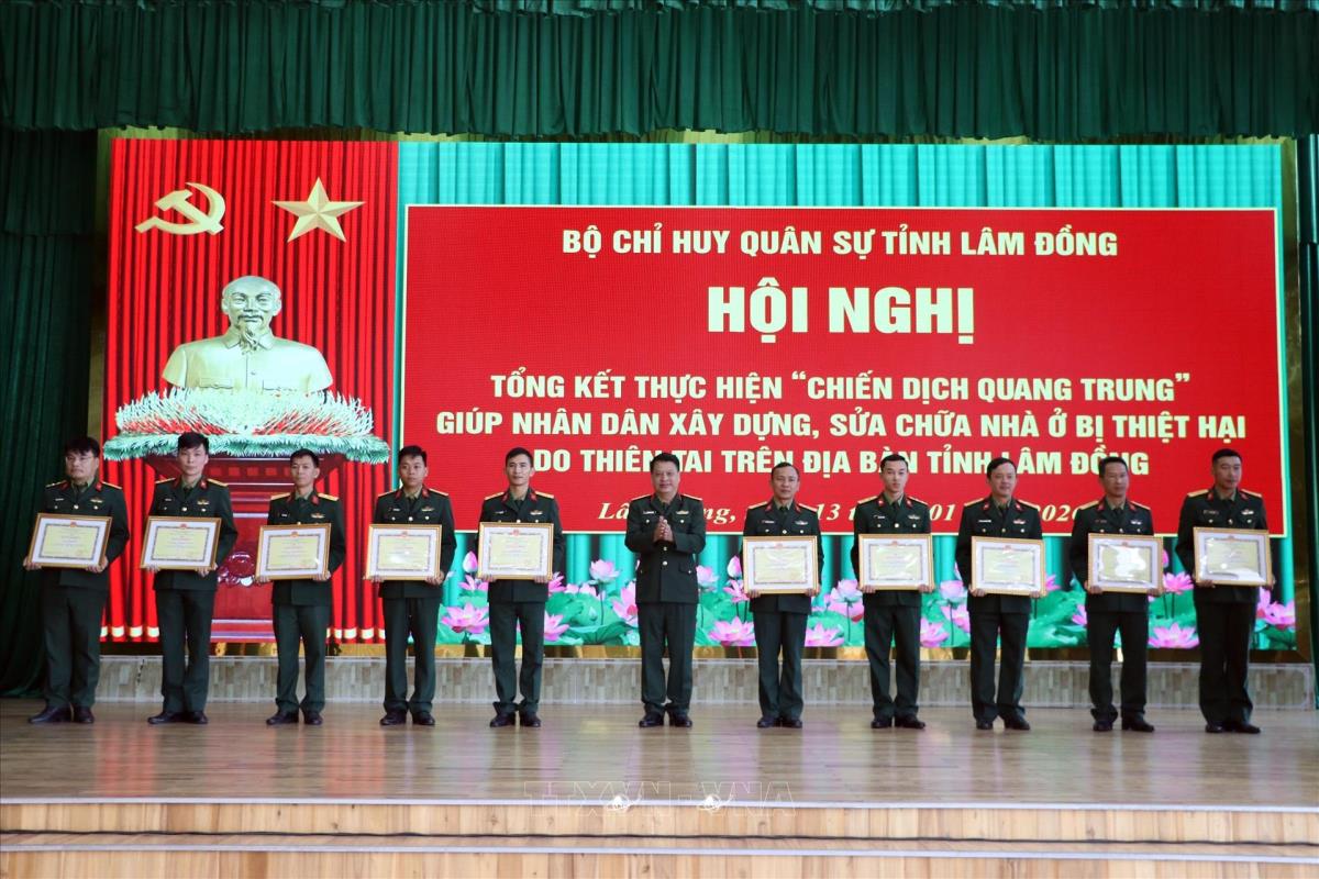 Đại tá Đinh Hồng Tiếng, Chỉ huy trưởng Bộ chỉ quân sự tỉnh Lâm Đồng, tặng Giấy khen cho các tập thể, cá nhân hoàn thành xuất sắc Chiến dịch Quang Trung (13/1/2026). Ảnh: Chu Quốc Hùng - TTXVN