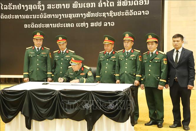 Cùng ngày, đoàn đại biểu Văn phòng Tùy viên Quốc phòng Việt Nam tại Lào cũng đến viếng đồng chí Khamtay Siphandone, nguyên Chủ tịch Đảng Nhân dân cách mạng Lào, nguyên Chủ tịch nước Cộng hòa dân chủ nhân dân Lào và ghi sổ tang, thể hiện tình hữu nghị giữa quân đội hai nước và mối quan hệ gắn kết của liên minh chiến đấu Việt Nam - Lào.