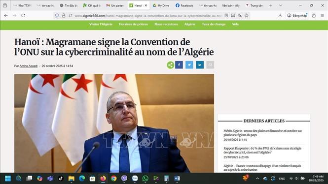 * Tại Algeria, báo điện tử Algerie360 cũng đăng bài viết nhận định việc Algeria ký kết Công ước Hà Nội là bước tiến lịch sử trong hợp tác quốc tế về an ninh số.