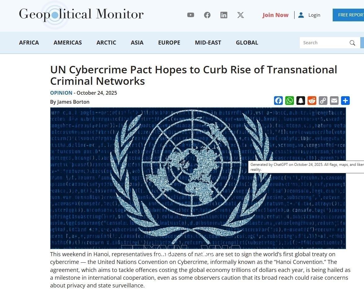 Trang báo viết: “Sự kiện tại Hà Nội là kết quả của 5 năm đàm phán giữa các quốc gia thành viên LHQ với sự tham gia của các chuyên gia, xã hội dân sự, giới học thuật và khu vực tư nhân. Văn kiện này thiết lập khuôn khổ quốc tế chung để chống tội phạm mạng; đưa ra các định nghĩa thống nhất, tiêu chuẩn điều tra chung và cơ chế hỗ trợ các nạn nhân. Công ước sẽ mở ra một kỷ nguyên mới trong việc bảo vệ người dùng mạng."