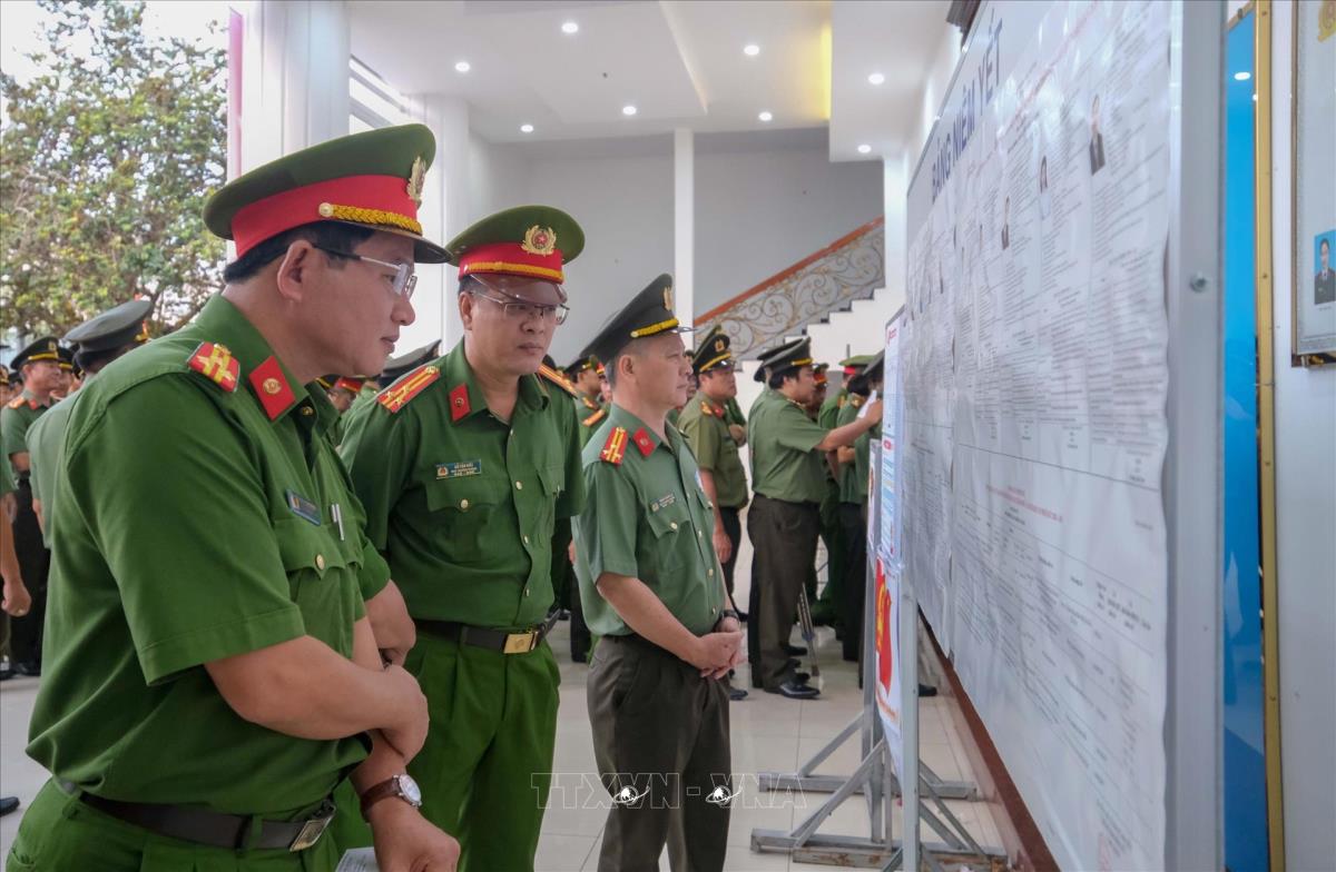 Cử tri Công an thành phố Cần Thơ nghiên cứu danh sách các ứng cử viên trước khi tham gia bầu cử (14/3/2026). Ảnh: Thanh Liêm - TTXVN