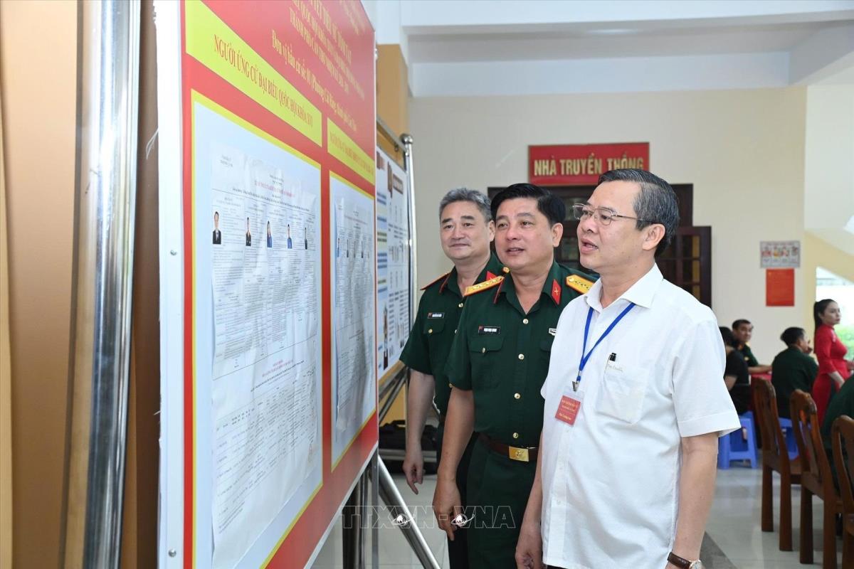Chủ tịch UBND thành phố Cần Thơ Trương Cảnh Tuyên xem danh sách các ứng cử viên được niêm yết tại Tổ bầu cử số 31 ở Bộ Chỉ huy quân sự thành phố Cần Thơ (14/3/2026). Ảnh: Thanh Liêm - TTXVN