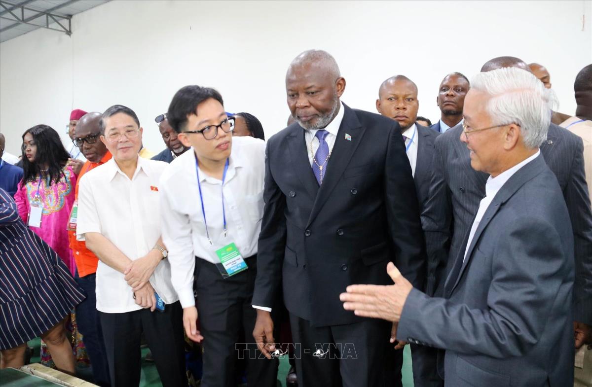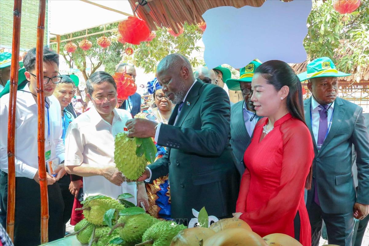Ngài Vital Kamerhe, Chủ tịch Quốc hội Cộng hòa Dân chủ Congo xem sản phẩm trái cây ở Sông Hậu Farm, huyện Cờ Đỏ (22/1/2025). Ảnh: Thanh Liêm - TTXVN