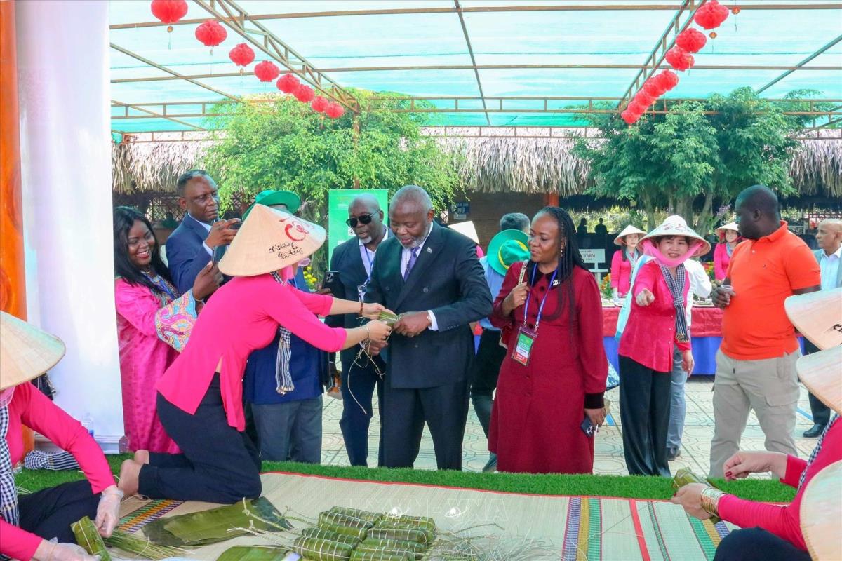 Chủ tịch Quốc hội Cộng hòa Dân chủ Congo Vital Kamerhe trải nghiệm gói bánh tét ở Sông Hậu Farm, huyện Cờ Đỏ (22/1/2025). Ảnh: Thanh Liêm - TTXVN