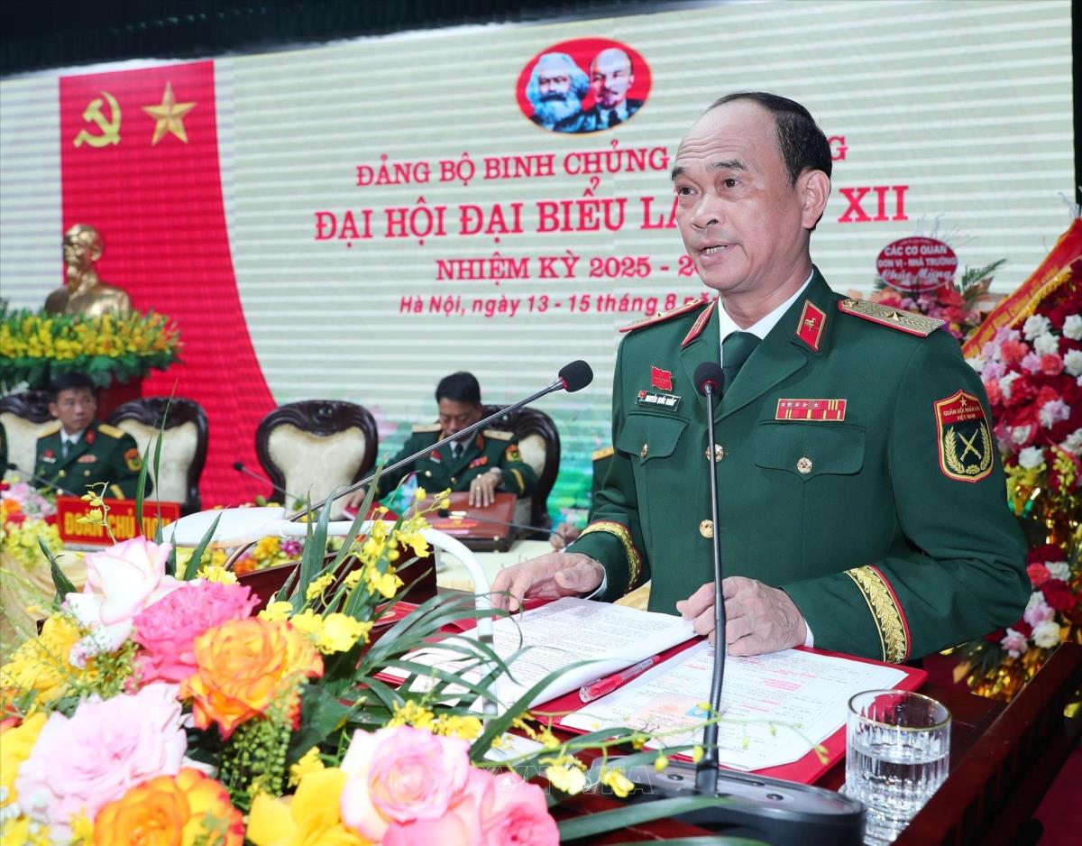 Thiếu tướng Nguyễn Quốc Duẩn, Bí thư Đảng ủy, Chính ủy Binh chủng Đặc công trình bày Báo cáo chính trị (14/8/2025). Ảnh: Trọng Đức - TTXVN