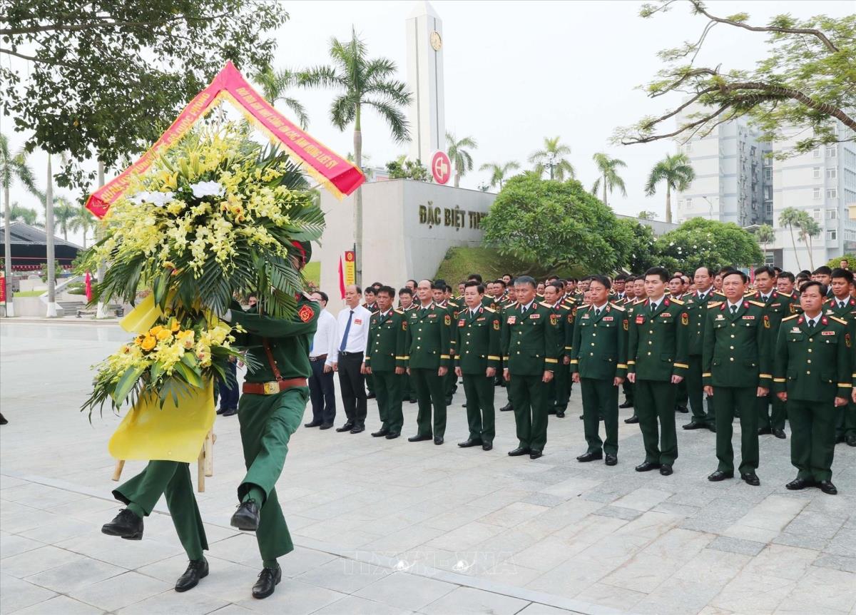 Thượng tướng Nguyễn Văn Hiền, Ủy viên Trung ương Đảng, Ủy viên Quân ủy Trung ương, Thứ trưởng Bộ Quốc phòng, Trung tướng Đỗ Xuân Tụng, Phó Chủ nhiệm Tổng cục Chính trị QĐND Việt Nam và đại biểu dâng hương tưởng niệm các Anh hùng, liệt sĩ trước giờ khai mạc Đại hội (14/8/2025). Ảnh: Trọng Đức - TTXVN