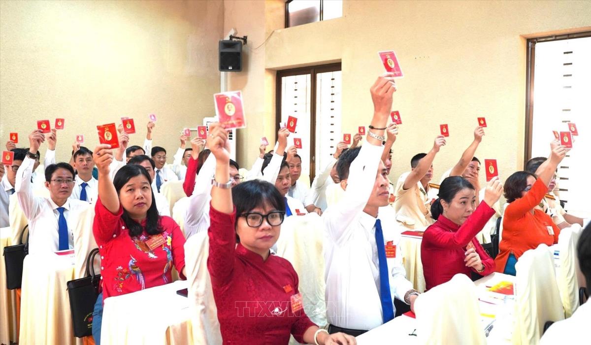 Các đại biểu bỏ phiếu biểu quyết thông qua các vấn đề quan trọng được nêu tại Đại hội đại biểu Đảng bộ Đặc khu Côn Đảo lần thứ nhất, nhiệm kỳ 2025-2030 (8/8/2025). Ảnh: TTXVN phát