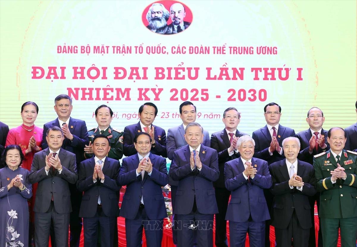 Tổng Bí thư Tô Lâm, Thủ tướng Phạm Minh Chính dự Đại hội đại biểu Đảng bộ Mặt trận Tổ quốc, các đoàn thể Trung ương lần thứ nhất (23/9/2025). Ảnh: Thống Nhất - TTXVN