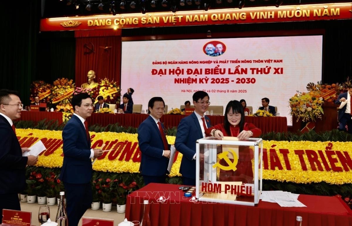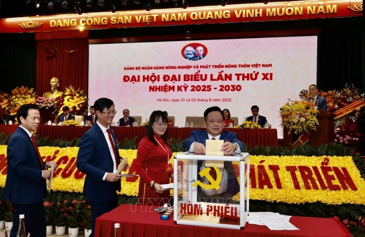Các đại biểu bỏ phiếu bầu Ban Chấp hành Đảng bộ Ngân hàng Nông nghiệp và Phát triển Nông thôn nhiệm kỳ 2025-2030 (2/8/2025). Ảnh: Trần Việt - TTXVN