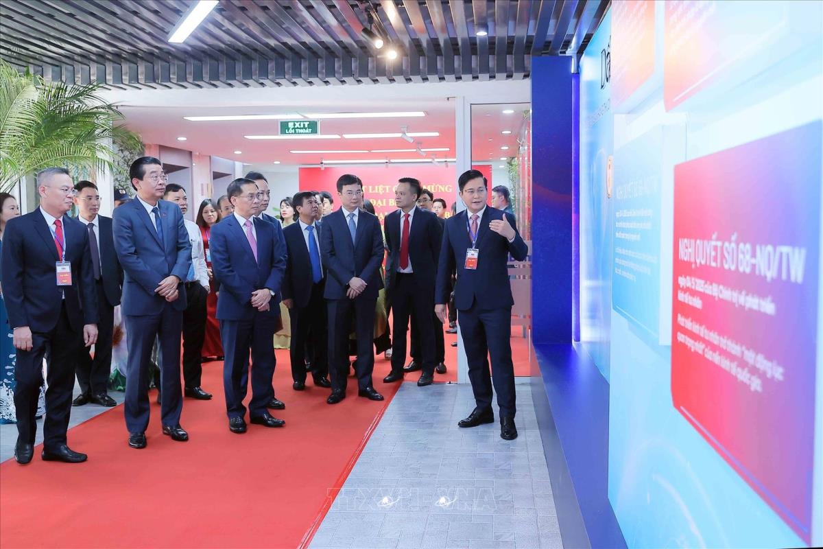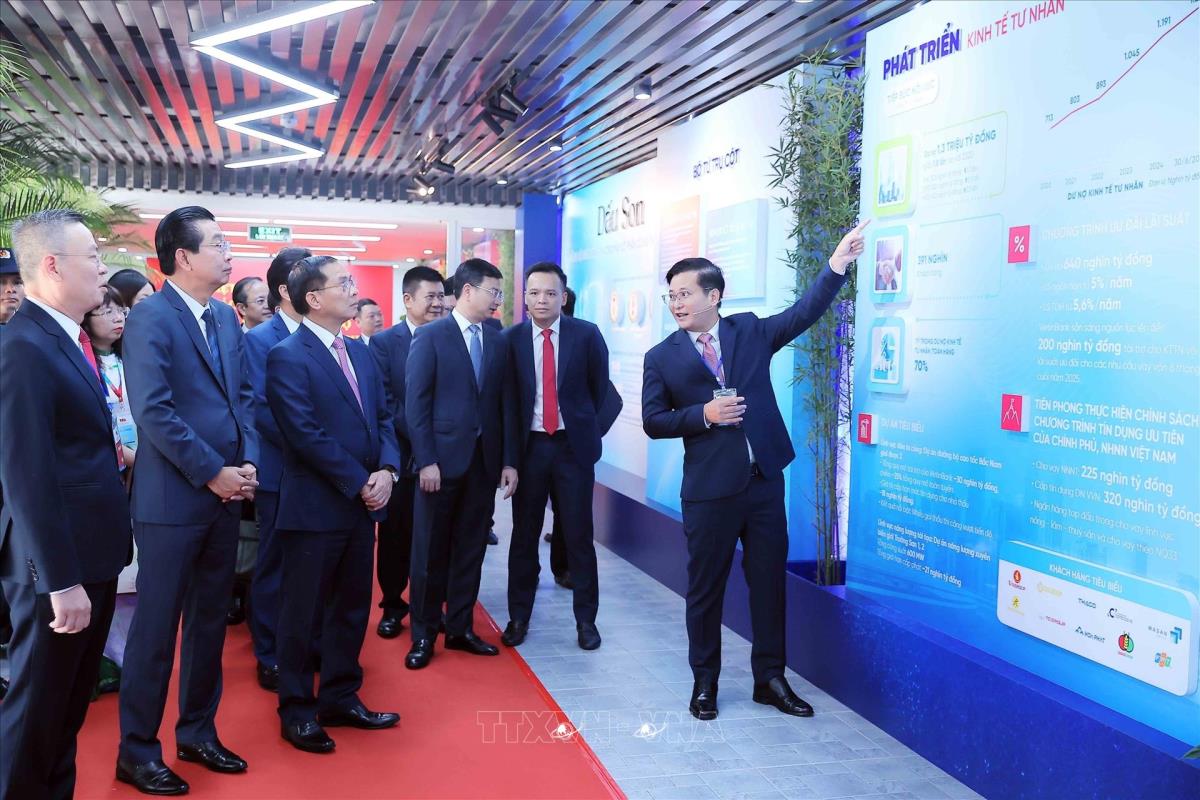 Các đại biểu tham quan trưng bày thành tựu của Ngân hàng Thương mại Cổ phần Công Thương Việt Nam (2/8/2025). Ảnh: An Đăng - TTXVN