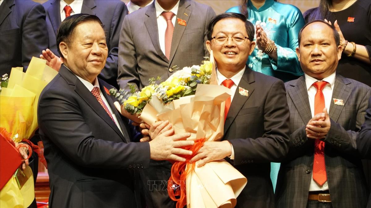 Đồng chí Nguyễn Trọng Nghĩa, Ủy viên Bộ Chính trị, Bí thư Trung ương Đảng, Trưởng Ban Tuyên giáo và Dân vận Trung ương, tặng hoa chúc mừng đồng chí Hồ Quốc Dũng, Bí thư Tỉnh ủy Gia Lai nhiệm kỳ 2020 - 2025 (3/10/2025). Ảnh: Đình Quân-TTXVN