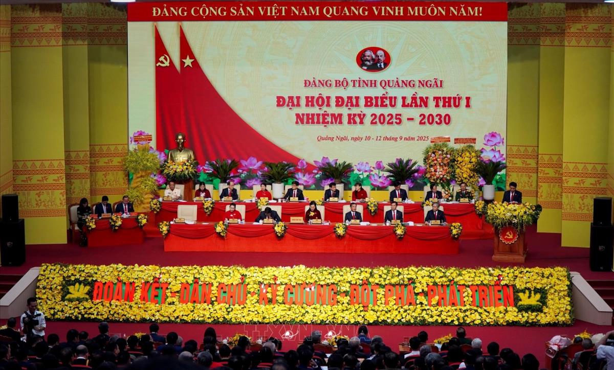 Quảng Ngãi (TTXVN 11/9/2025) Sáng 11/9, tại Trung tâm Hội nghị và Triển lãm tỉnh Quảng Ngãi, Đại hội Đại biểu Đảng bộ tỉnh Quảng Ngãi lần thứ I, nhiệm kỳ 2025 - 2030 chủ đề “Đoàn kết - Dân chủ - Kỷ cương - Đột phá - Phát triển” diễn ra phiên khai mạc, với sự tham gia của 450 đại biểu, đại diện cho gần 92.000 đảng viên trong toàn tỉnh. Ủy viên Bộ Chính trị, Phó Thủ tướng Thường trực Chính phủ Nguyễn Hòa Bình dự và chỉ đạo Đại hội.