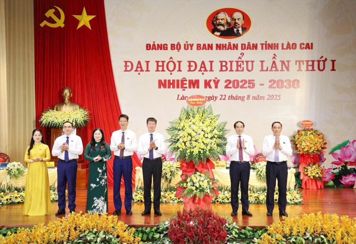 Thường vụ Tỉnh ủy Lào Cai tặng hoa chúc mừng Đại hội (22/8/2025). Ảnh: Tuấn Anh - TTXVN